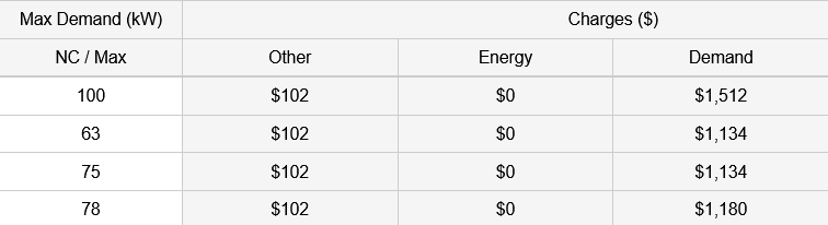 The rate schedule in the above example uses a demand ratchet that is 75% of the max annual demand. Of the 4 billing periods shown, 100 kW is the greatest demand reading, resulting in $1,512 in demand charges. The next two monthly demands are 63 kW and 75 kW, both of which are less than or equal to 75% of 100 kW, which means the identical demand totals of $1,134 are the result of the 75% ratchet in place. The demand totals are the same until we get to 78 kW, which is greater than 75% of 100 kW, resulting in a slightly higher demand total than the previous months.