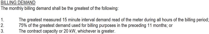 The utility will determine the billing demand by taking the greater of the current billing period’s max metered demand, 75% of the max demand in the past 11 months, or the minimum or contract demand.